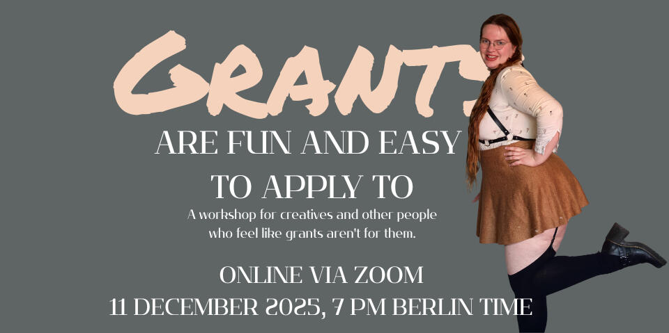 A workshop for creatives and other people who feel like grants aren't for them.In this workshop, you will conquer the barriers that keep us from taking advantage of grant money! In 2 hours, you will learn where to find grants, how to quickly assess your eligibility (hint: you can apply for anything, it's not illegal), how to prepare a CV that will make applying for everything easy, and how to write project descriptions in 45 minutes or less. After this workshop, you will be ready to snap up funding with ease and no stress at all.11 January 2025, 5 PM Berlin Time