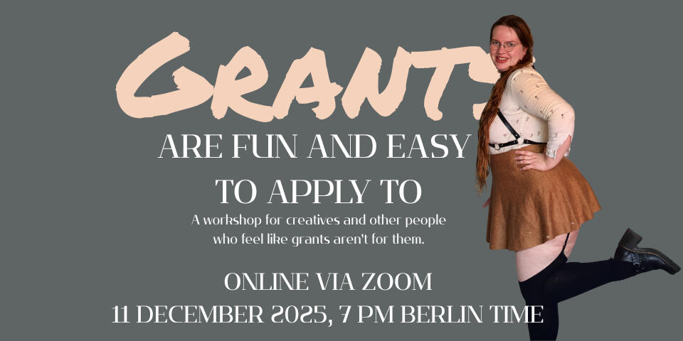A workshop for creatives and other people who feel like grants aren't for them.In this workshop, you will conquer the barriers that keep us from taking advantage of grant money! In 2 hours, you will learn where to find grants, how to quickly assess your eligibility (hint: you can apply for anything, it's not illegal), how to prepare a CV that will make applying for everything easy, and how to write project descriptions in 45 minutes or less. After this workshop, you will be ready to snap up funding with ease and no stress at all.11 December 2025, 7 PM Berlin Time